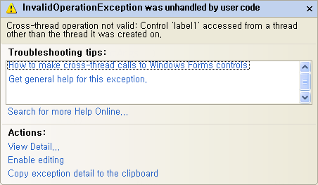label1.Text = DateTime.Now.ToString(); 에서 라벨 컨트롤에 접근을 하려고 하는데, 문제는 이 코드가 실행되는 스레드가 라벨 컨트롤이 생성된 스레드(메인 스레드, UI 스레드)가 아니라는 것입니다.