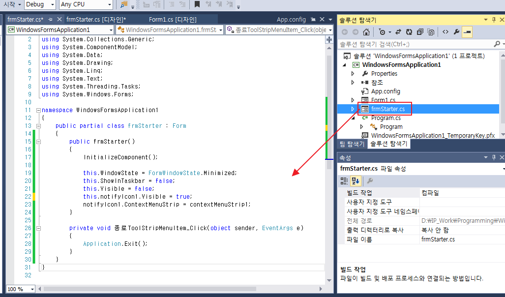 실행 폼이 여러개라면 맨처음에 실행될 frmStart 를 시작 폼으로 기록해 둔다.
