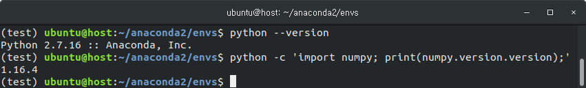 현재의 test 환경을 확인해 보도록 하겠습니다. 다음 명령어로 Python 버전과 numpy 버전을 출력하면 다음과 같습니다.