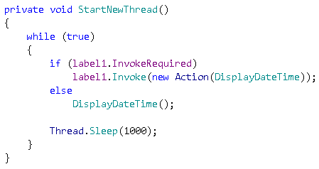 label1.Text = DateTime.Now.ToString(); 에서 라벨 컨트롤에 접근을 하려고 하는데, 문제는 이 코드가 실행되는 스레드가 라벨 컨트롤이 생성된 스레드(메인 스레드, UI 스레드)가 아니라는 것입니다.