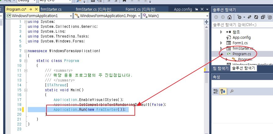 실행 폼이 여러개라면 맨처음에 실행될 frmStart 를 시작 폼으로 기록해 둔다.