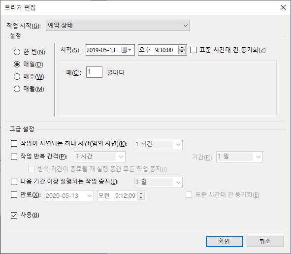 작업 스케줄러 트리거는 하루에 한번 지정한 시간에 실행하는 것으로 설정